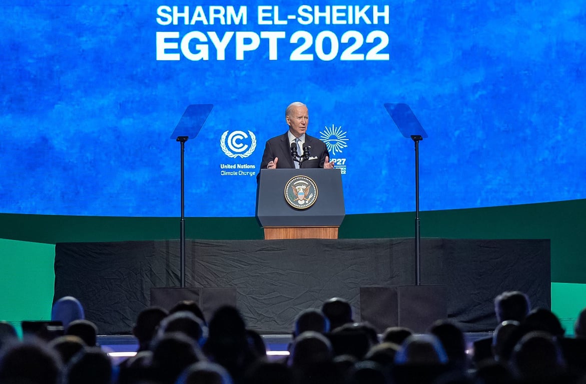 Лідерство США з екологічних питань розпочалося з першого дня його президентства, коли Штати знову приєдналися до Паризької кліматичної угоди. Продовженням рішучості Байдена лідирувати у міжнародних питаннях також стала згода США на створення фонду "втрат і збитків" на Конференції ООН з питань зміни клімату (COP27) в Єгипті, після 30-річних заперечень. Фонд покликаний компенсувати біднішим країнам збитки від зміни клімату.