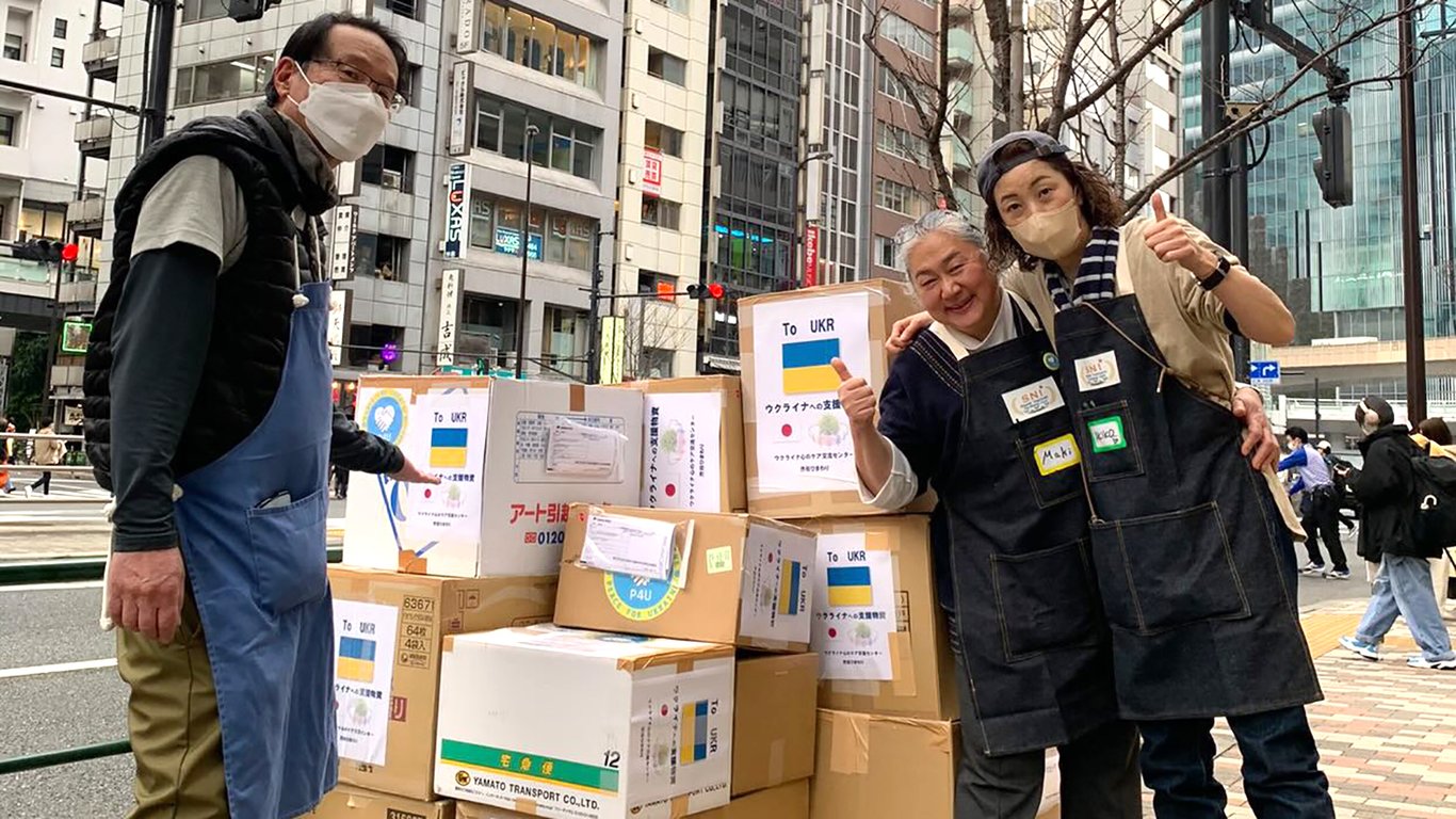 Близько 2500 українських біженців нині проживає у Японії. Щоб підтримати їхні родини, які залишилися на батьківщині, японські волонтери, спільно з центром допомоги при національній психологічній асоціації Японії у Токіо влаштували акцію з відправлення пакунків в Україну.
