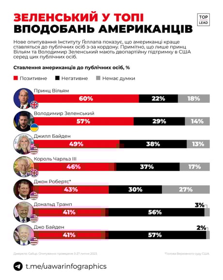 Друге місце обійняв глава української держави Володимир Зеленський, до якого позитивно ставиться 57% населення США.