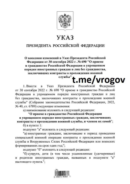 Согласно новому указу Путина, в упрощенном режиме получить гражданство России смогут иностранцы, подписавшие контракт о прохождении военной службы в российской армии, а также члены их семей.