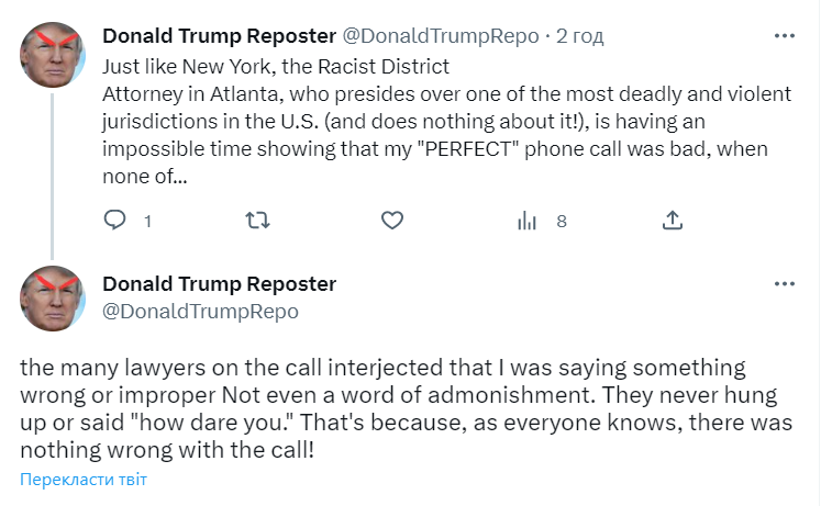 "Як і в Нью-Йорку, расистський окружний прокурор в Атланті, який очолює одну з найбільш смертоносних і насильницьких юрисдикцій у США (і нічого з цим не робить!), переживає неймовірні часи, показуючи, що мій "ідеальний" телефонний дзвінок був поганим. Жоден із багатьох юристів під час дзвінка не втрутився, що я говорю щось неправильне чи некоректне – навіть жодного слова попередження", — розповів Трамп.