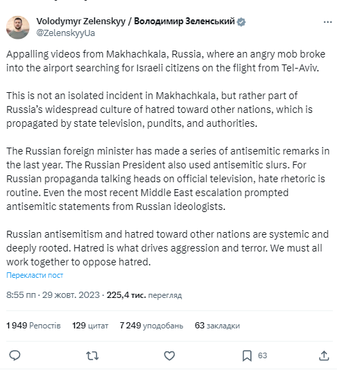 Президент України Володимир Зеленський прокоментував антисемітський бунт у Дагестані. Глава держави заявив, що "ненависть до інших народів" — це частина російської культури.